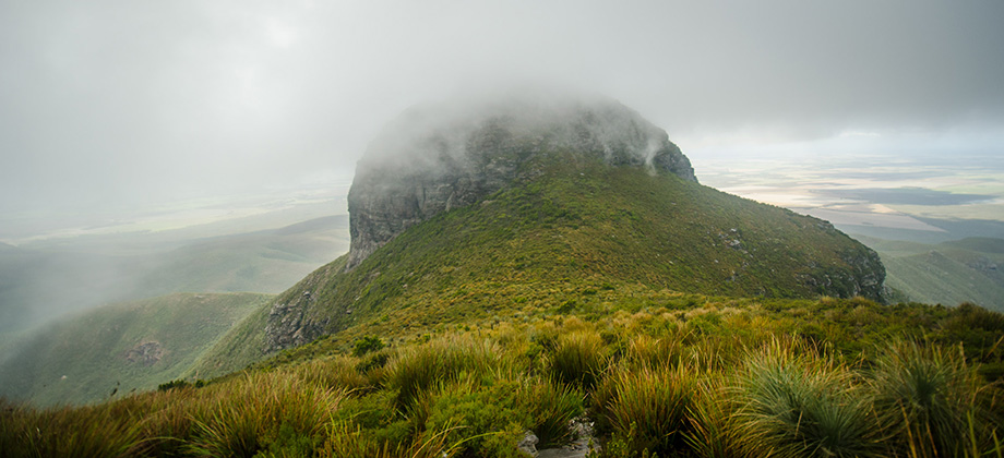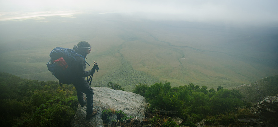 The ascent up to the first arrow was also surprisingly straightforward, the descent on the other hand was a different matter entirely. The route that we had to take dropped down the right side of the arrow shortly after the summit and then proceeded to edge its way back up the north-west pinnacle after passing the junction that led down to the escape track to the North Mirlpunda Track. Things became a little tricky as low clouds began to descend upon us, greatly limiting our visibility. The route that we were trying to follow ultimately led us to a sheer ridge that seemed insurmountable, but as we reached the edge, we noticed the presence of a rope that had been tied in as an anchor point for roped-descents. After spending some time mulling over our options, we decided that the best choice we had would be to track back along the route from where we came, and instead to zig-zag and drop down the side of the arrow to the path that flanked the base on the right (northern) side. This path ended up bringing us to the base of the sheer ridge that we had been unable to pass earlier.