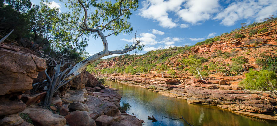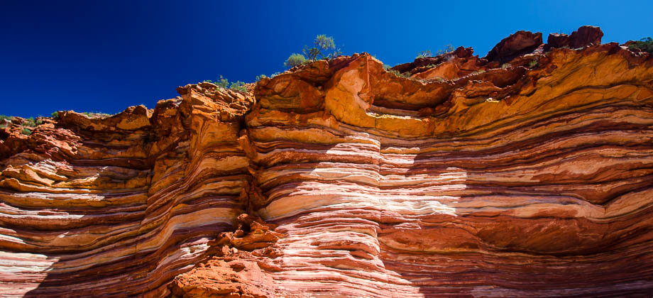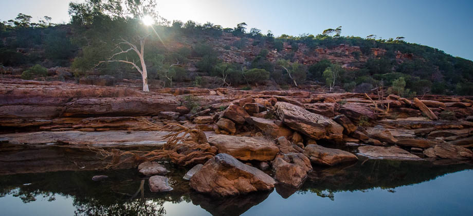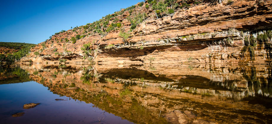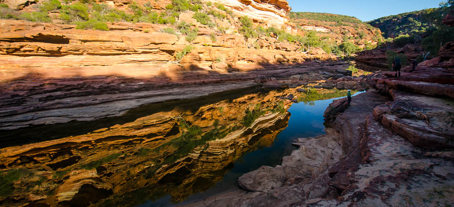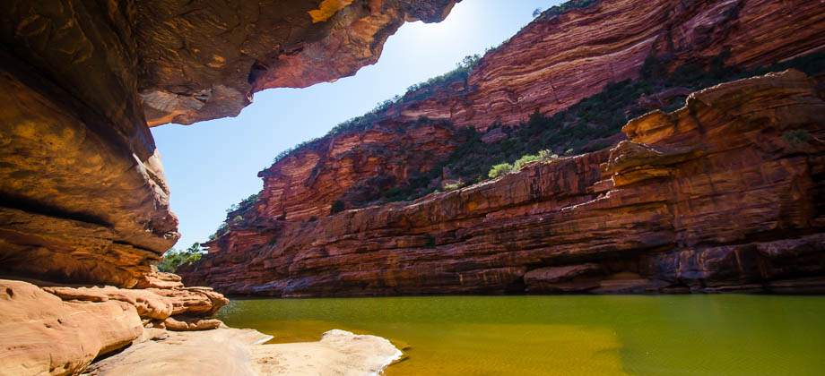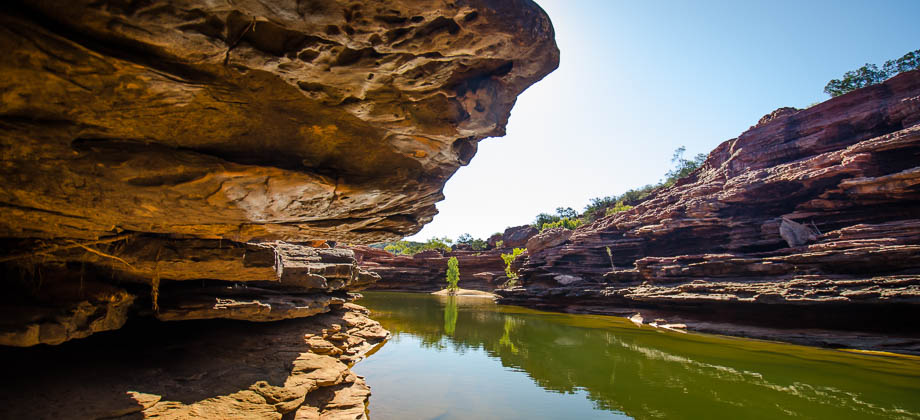 The gorge seemed to fluctuate over time. The walls would close in on us, often to the point where traversing was required, and cause everything to go deathly silent; the gorge would then open up, and the familiar sounds of trickling water and twittering birds would return. The cliffs however, would always soar up and around us, and the contrast always remained - the green, frilly algae in the terraces underwater and the azure skies, with the deep red and orange sandstone.